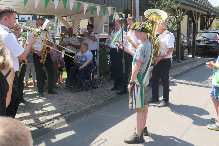 Diesen langen Festzug begleitete auch in diesem Jahr wieder die Kapelle der Freiw. Feuerwehr Gummersbach, die hinter dem Hauptmann die polizeibegleitete „Prozession“ anführte, gefolgt von der Kutsche mit den bei-den Majestäten, der Ehrendame der Königin: Ruth Ndombele und der Meisterschützin Hannah Hoffmann. So zog der schöne Zug durch das ganze Dorf, wo viele Nachbarn an den Fenstern den Regenten zuwinkten.