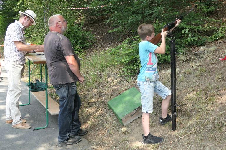 Zurück auf dem Festplatz folgte dann das zweite wichtige Schießen in den Reihen der Kinder. Auch hier hatte die amtierende Majestät nur den 1. Schuss auf den noch frischen Vogel, dann durften die Aspiranten auf die Nachfolge in einer festen Reihenfolge ihr Glück versuchen – beobachtet und angefeuert von sehr zahlreichen Schaulustigen, unter denen sich in diesem Jahr sogar Besucher aus Waren/Müritz und Buxtehude befanden. Nach zähem Ringen konnte schließlich der 9-jährige Michail Halezki den Goldenen Schuss landen und wurde kurz darauf von seinem stolzen Vater ins Festzelt getragen, wo er von den jubelnden Reininghäusern empfangen wurde.