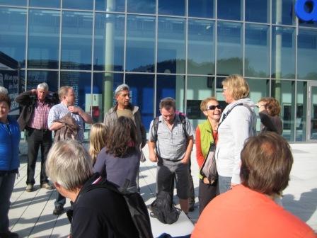 Nach der Pause erwartete uns mit Harald Kawczyk einer der Geschäftsführer der Schwalbe Arena vor der Sporthalle zu einer sehr informativen und mit Detailwissen über Planung und Bau